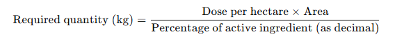 When a wettable powder (WP) has less than 100% active ingredient, the quantity of formulation required is calculated using: