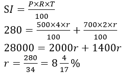 We are given two sums of money: ₹500 for 4 years and ₹700 for 2 years. The combined simple interest is ₹280. We are asked to find the rate of interest (R).