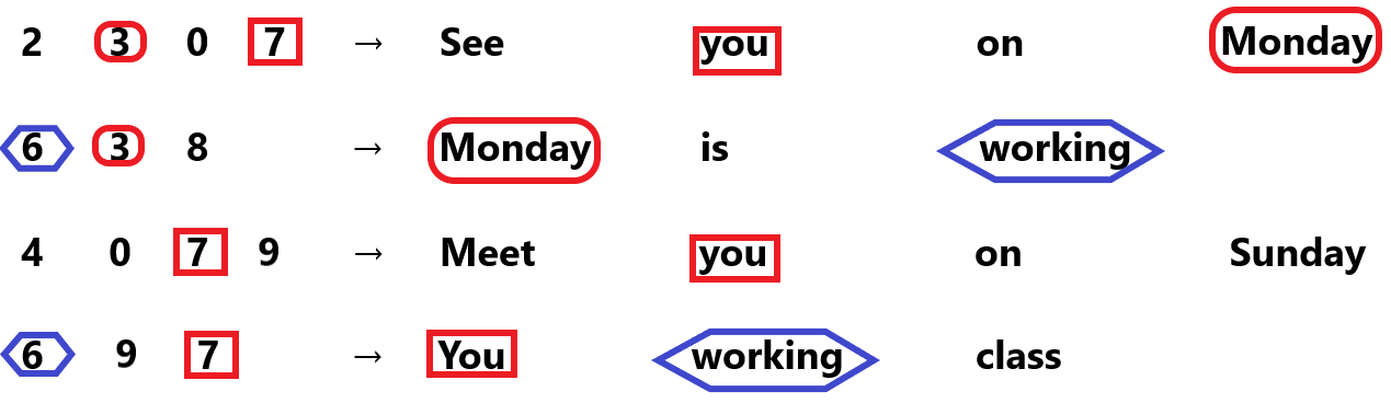 If 'sti pri nro' means 'I love coffee', 'pri min zei' means 'Coffee is hot' and 'min sti bse' means 'Love hot weather', which code stands for 'Love weather'?