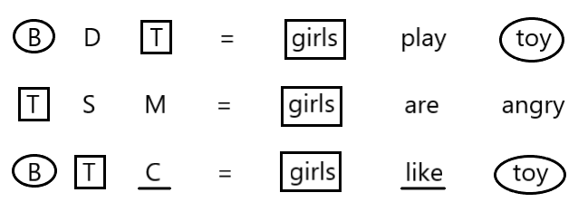 In a certain code language, 'BDT' means 'girls play toy', 'TSM' means 'girls are angry' and 'BTC' means 'girls like toy'. Which of the following letters will mean 'like' in that language?