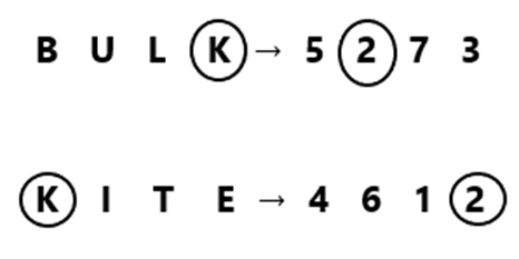In a certain code language, ‘BULK’ is coded as ‘5273’ and ‘KITE’ is coded as ‘4612’. What is the code for ‘K’ in the given code language?