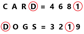 In a certain code language, ‘CARD’ is coded as ‘4681’ and ‘DOGS’ is coded as ‘3219’. What is the code for ‘D’ in the given code language?