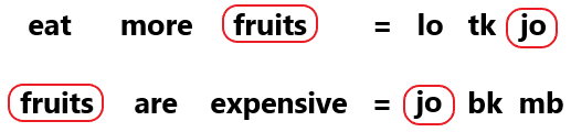 In a certain code language, 'eat more fruits' is coded as 'lo tk jo' and 'fruits are expensive' is coded as 'jo bk mb'. How is 'fruits' coded in the given language?
