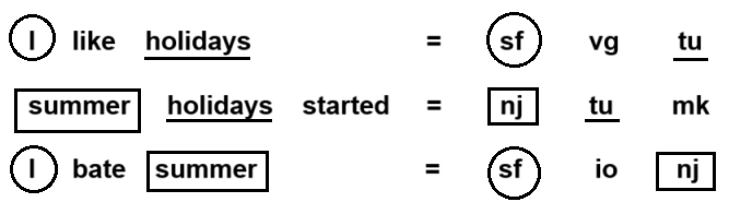 If 'sti pri nro' means 'I love coffee', 'pri min zei' means 'Coffee is hot' and 'min sti bse' means 'Love hot weather', which code stands for 'Love weather'?