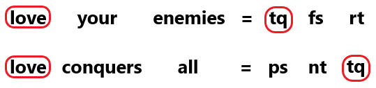 In a certain code language, ‘love your enemies’ is coded as ‘tq fs rt’ and ‘love conquers all’ is coded as ‘ps nt tq’. How is ‘love’ coded in the given language?