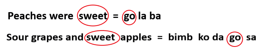 ‘Peaches were sweet‘ is written as ' go la ba’.