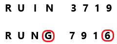 In a certain code language, 'RUIN' is coded as '3719' and 'RUNG' is coded as '7916'. What is the code for 'G' in the