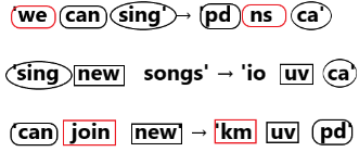 'we can sing' is coded as 'pd ns ca', 'sing new songs' is coded as 'io uv ca', 'can join new' is coded as 'km uv pd'.