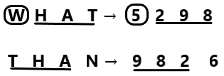 In a certain code language, 'WHAT' is coded as 5298 and 'THAN' is coded as 9826. What is the code for 'W' in the given code language?