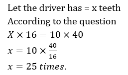 In a certain gear train, the driver gear has ________ teeth while the follower gear has 10 teeth. For every 16 turns of the driver the follower turns 40 times.