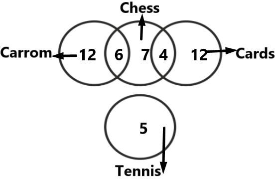 In a class of 46 students, 18 play carom; 17 play chess, including 6 who play carom; 16 play cards, including 4 who play chess, but not carom; and 5 play only tennis. Which of the following figures represents these facts?