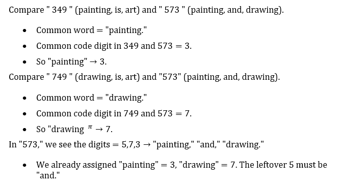 In a code language, 349 means ‘painting is art’, 749 means ‘drawing is art’ and 573 means ‘painting and drawing’. Find the code for ‘and’.