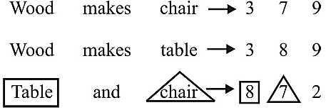 In a code language, 379 means 'wood makes chair', 389 means 'wood makes table', 872 means 'table and chair'. Find the code for 'and'.