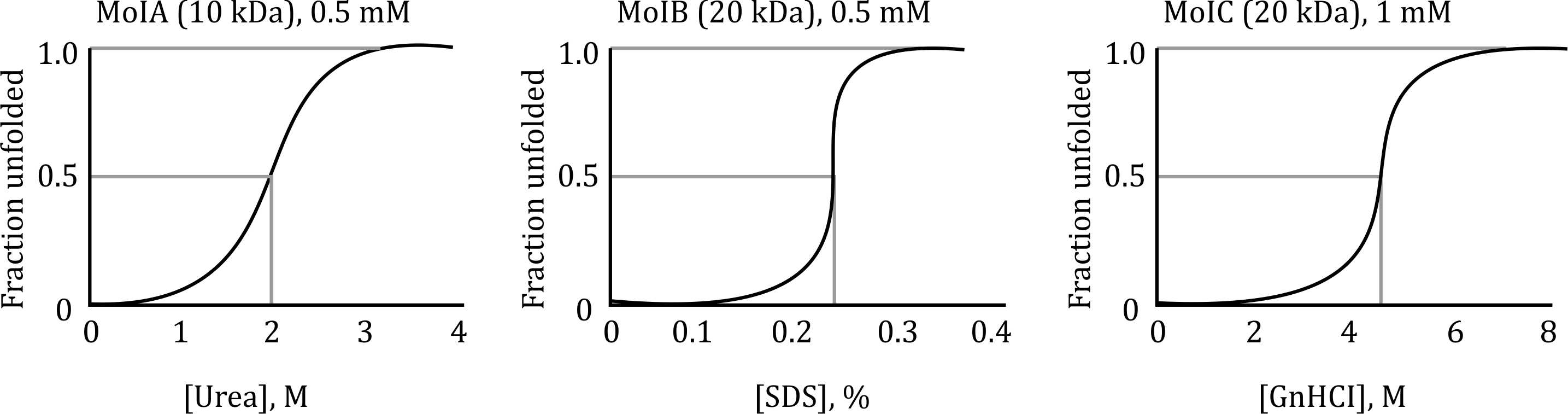 - Larger proteins like MolC (20 kDa) require higher concentrations of denaturants to unfold compared to smaller proteins like MolA (10 kDa).