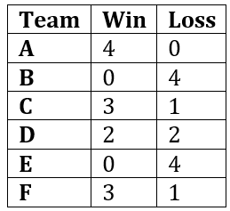 2. There are 6 teams (A, B, C, D, E, F) with the following win/loss records: