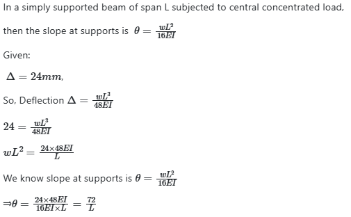 In a simply supported beam of span L subjected to central concentrated load, the central deflection is 24 mm. Then the slope at supports is: