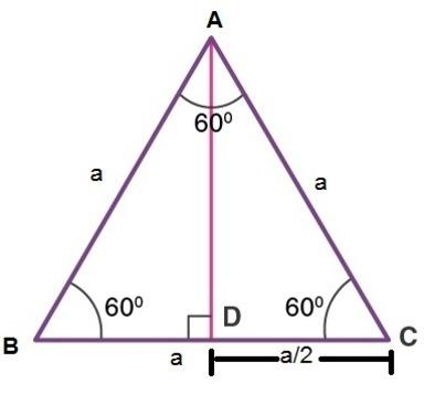 In equilateral triangle ABC with side a , if we draw an perpendicular from the point A it divides the side BC at D into two equal halves such that BD = DC.
