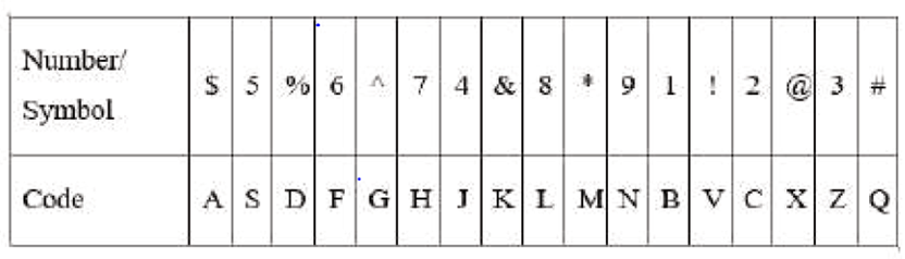 | Code | 7 | $ | @ | 9 | 2 | % | 6 | 4 |