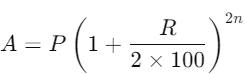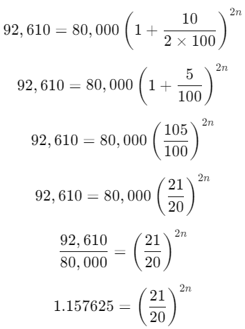 Given: Principal (P) = Rs. 80,000, Amount (A) = Rs. 92,610, Rate of interest (R) = 10% per annum compounded half-yearly.