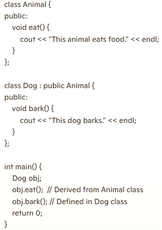 Here, the Dog class inherits the Animal class's properties and methods.