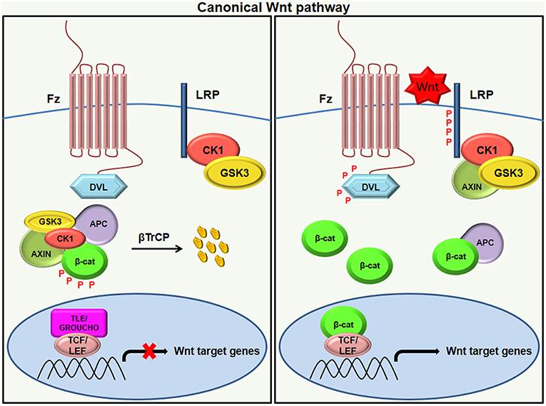 In response to a Wnt signal, β-catenin enters the nucleus and binds to the LEF1/TCF transcription factors, which regulate the expression of target genes. Groucho, a transcriptional repressor, is bound to LEF1/TCF proteins in the absence of β-catenin, preventing transcription. When β-catenin enters the nucleus, it displaces Groucho, allowing LEF1/TCF to activate transcription and thus leading to the expression of Wnt target genes. This displacement is essential for the transcriptional activation in Wnt signaling.