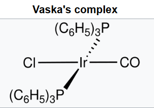 Vaska's complex is the trivial name for the chemical compound trans-carbonylchlorobis(triphenylphosphine)iridium(I), which has the formula IrCl(CO)[P(C6H5)3]2. This square planar diamagnetic organometallic complex consists of a central iridium atom bound to two mutually trans triphenylphosphine ligands, carbon monoxide and a chloride ion.