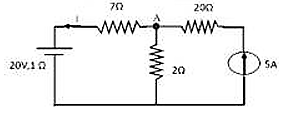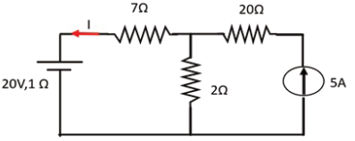In the circuit shown here, the 20 V source has an internal resistance of 1 Ω. While the current source is ideal, the value of current I is _________.