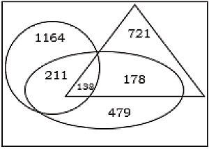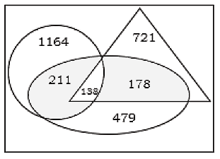In the diagram below, the rectangle represents students, the circle represents girls, the oval represents the arts faculty, and the triangle represents sports. The numbers in the different sections show the count of people in that section. How many girl students have chosen the arts faculty and do not participate in sports, and how many students participate in sports but are not girls and have chosen the arts faculty?