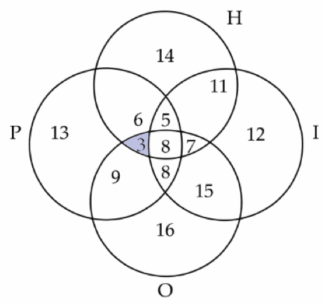 In the diagram given below, circle H represents honest, circle I represents intelligent, circle O represents optimistic, and circle P represents punctual persons.