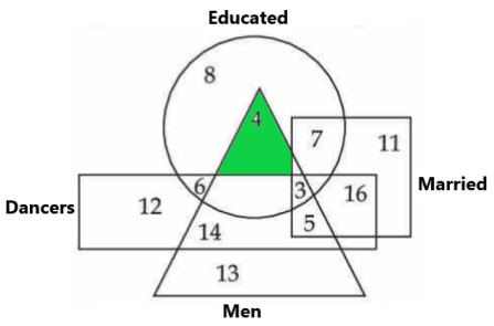 Square represents married, Circle represents educated, Triangle represents men, and Rectangle represents dancers.