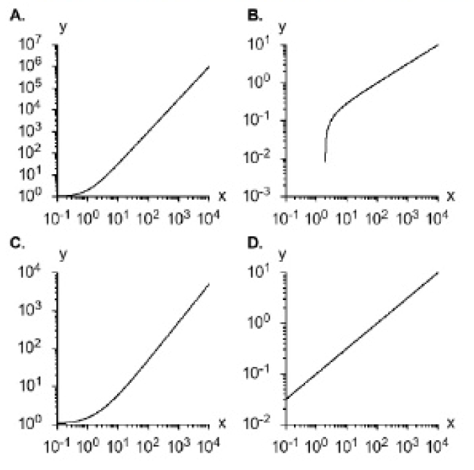 - In a log-log plot, if y = 10c.xm. the relationship appears as a straight line.