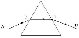 - In the given figure, an incident ray (AB) enters a triangular prism at point B. This is the initial path of light as it moves from air into the prism.