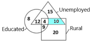 In the following diagram, the circle represents educated, triangle represents unemployed and square represents rural, then the number of rural people who are uneducated and unemployed will be-