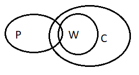 Based on the statements, some P are W and all W are C, which implies that the P that overlap with W must also be C. Therefore it is incorrect to say that no P is C; in fact, some P must be C Conclusion II: No P is C.