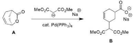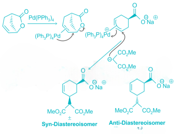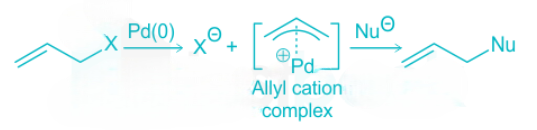 Allylic compounds with a good leaving group can form pi-allyl cation complex of palladium (0) via nucleophilic displacement reaction with controlled stereochemistry and regiochemistry. The pi-allyl cation complex gives the product upon attack by a nucleophile. An example is shown below:
