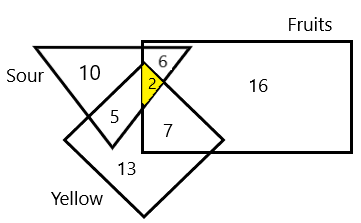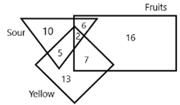 In the following Venn diagram. the rectangle represents ‘fruits’. the triangle represents ‘sour tasting eatables. and the square represents 'yellow co
