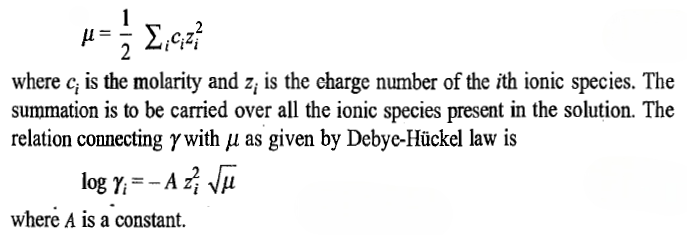 The activity coefficient of the ion depends upon the ionic strength μ of the solution. The latter is defined as