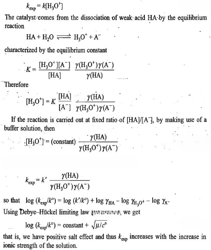 There is another type of salt action, known as the secondary salt effect which influences the rate of reaction by altering the effective concentration of the catalyzing species. Take, for example, the hydrolysis of cane sugar catalyzed by a weak acid. The experimental rate constant is given by