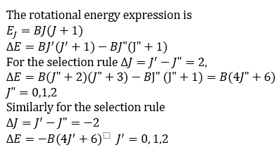 The selection rules for the pure rotational Raman spectra of diatomic molecules are ΔJ= 0 and ΔJ= ±2. The selection rule ΔJ= 0 gives rise to the Rayleigh scattering only. The selection rule ΔJ= ±2 gives rise to the Raman lines.