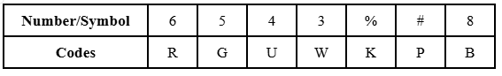 | Code | 7 | $ | @ | 9 | 2 | % | 6 | 4 |