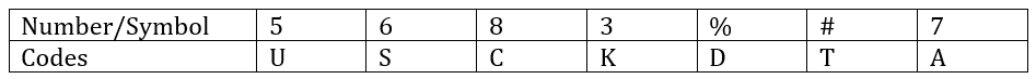 | Code | 7 | $ | @ | 9 | 2 | % | 6 | 4 |