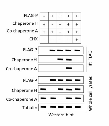 - The co-IP results show bands for both chaperone H and co-chaperone A when FLAG-P is present, indicating that protein P interacts with both chaperones.