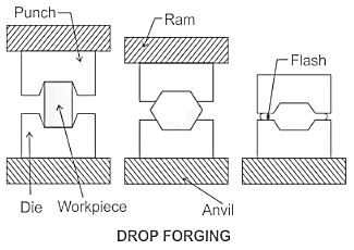 Involves dropping a hammer onto the workpiece, which is held in a specially shaped