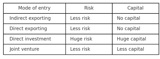 Direct investment involves establishing a physical presence in a foreign market through the ownership or significant control of facilities, production units, or subsidiaries. This mode of entry has the