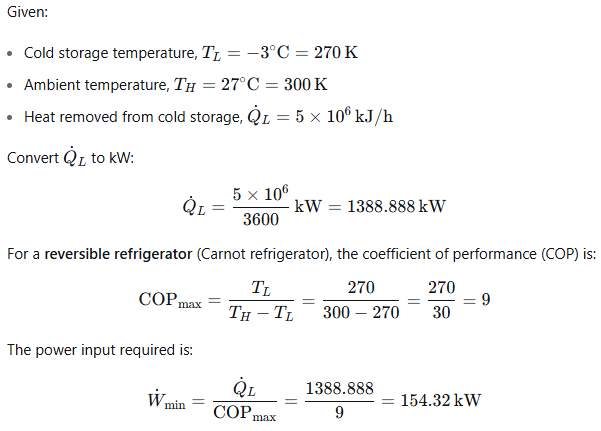 It is proposed to build refrigeration plant for a cold storage to be maintained at –3°C. The ambient temperature is 27°C. If 5 × 10⁶ kJ/h of energy is to be continuously removed from the cold storage, the minimum power required to run the refrigerator will be