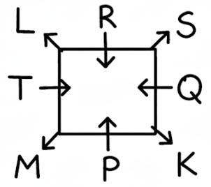 K, L, M, P, Q, R, S and T are sitting around a square table in such way that four sit at corners and four sit in the middle. Those who sit at corners are facing outside and those who sit in the middle are facing towards the centre. P is 3rd to the right of S and facing towards the centre. Q is 3rd to the left of M and M is sitting to the immediate left of P. One person sits between Q and R. R is not the neighbour of M. T is facing towards the centre. K is not the neighbour of R. Who is sitting between Q and R?