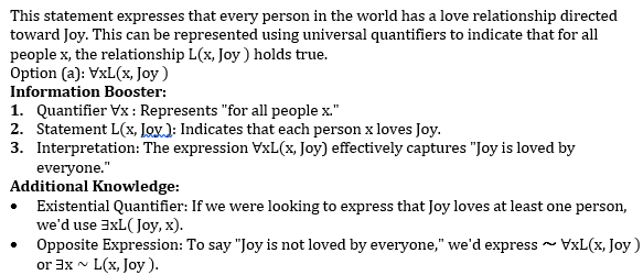 Let L (x, y) be the statement “x loves y” where the domain for both x and y consists of all people in the world. Use quantifiers to express “Joy is loved by everyone”.