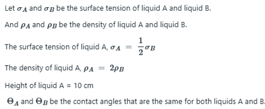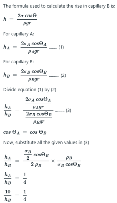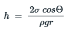 Suppose a liquid has a surface tension σ with density ρ. It rises to a height h in a capillary whose inner radius is r and g is the acceleration due to gravity, then the formula which is generally employed to find the rise in the capillary is: