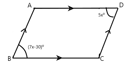Looking at the following figure, where angle B and D are (7x-30)° and 5x° respectively. we can say that the value of x is: