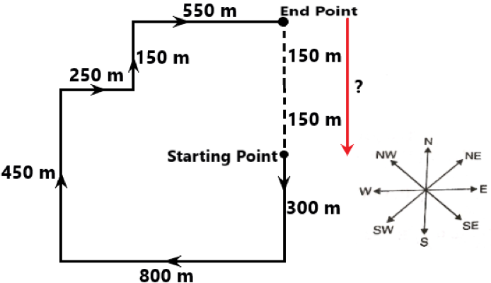 M starts from her home, walks 300 m south, turns right and walks 800 m, turns right and walks 450 m, turns right and walks 250 m, turns left and walks 150 m and then turns right and walks 550 m. How much distance and in which direction should she walk back to reach her home by the shortest route?